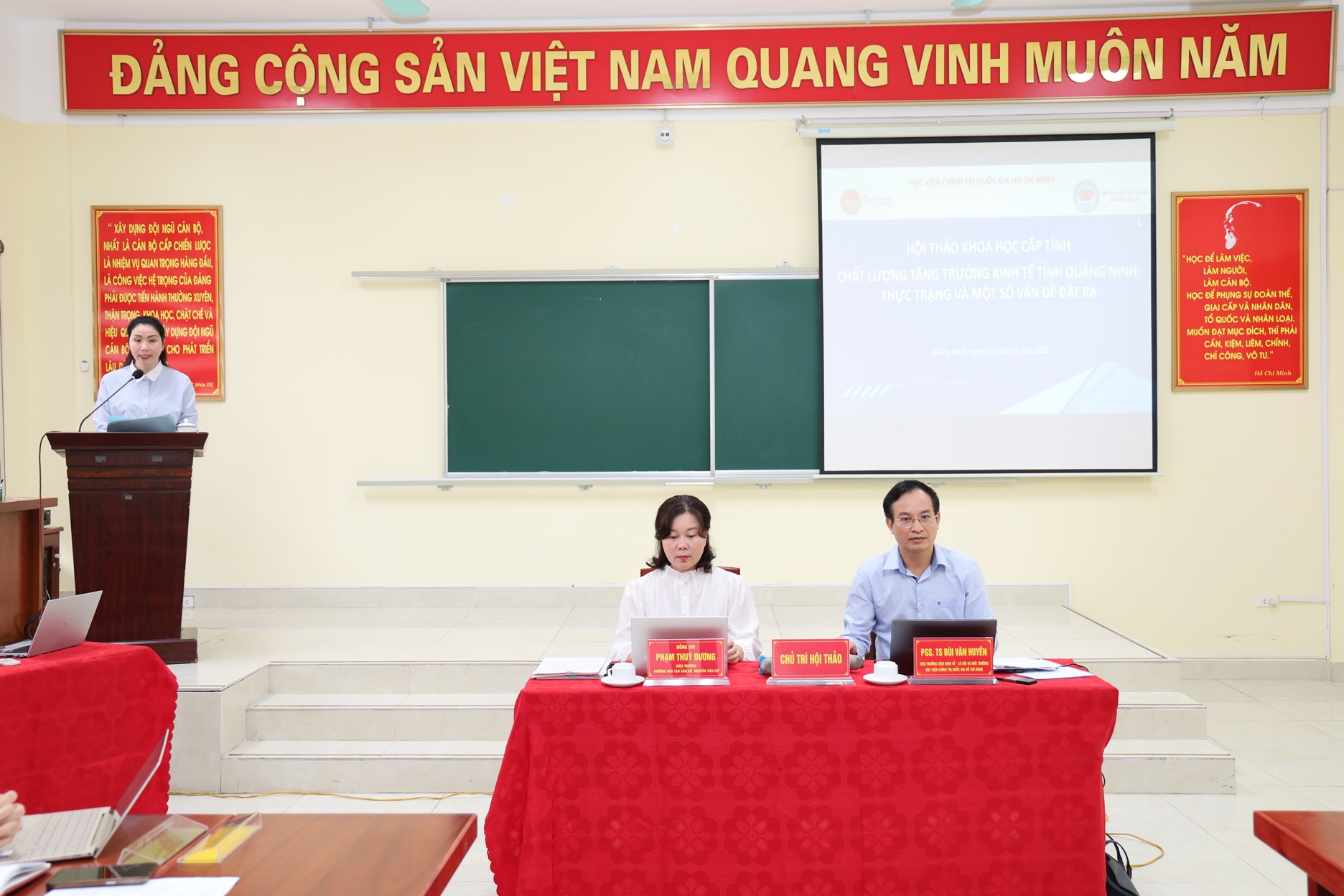 PGS.TS Bùi Văn Huyền, Viện trưởng Viện kinh tế - Xã hội và Môi trường, Học viện Chính trị quốc gia Hồ Chí Minh trình bày đề dẫn Hội thảo. Đồng chí nêu bật những thành tích Quảng Ninh đã đạt được trong tăng kinh tế, là tỉnh nằm trong nhóm các địa phương có sự bứt phá phát triển mạnh mẽ của cả nước; vị thế kinh tế của tỉnh tăng trưởng nhanh, trong 10 năm qua, Quảng Ninh đạt thành tích ấn tượng, nằm trong top 10 của cả nước về mức độ phát triển kinh tế- xã hội với chính sách phát triển kinh tế đặc biệt, mô hình phát triển sáng tạo, cơ chế kinh tế chuyển dịch theo hướng tích cực, thu nhập người dân luôn được cải thiện; ngồn tài nguyên thiên nhiên, di sản phong phú... Bên cạnh đó, trong bối cảnh mới, Quảng Ninh vẫn còn một số tồn tại, hạn chế, những thách thức không nhỏ trong quá trinh chuyển dịch cơ cấu kinh tế, chuyển dịch liên ngành ...Qua Hội thảo, đồng chí mong muốn các tham luận và ý kiến tham góp tập trung làm rõ những tiềm năng, thế mạnh cùng cơ hội, thách thức, hạn chế của tỉnh và trao đổi thảo luận, tập trung làm rõ những nhiệm vụ, giải pháp nâng cao chất lượng tăng trưởng kinh tế tỉnh Quảng Ninh trong thời gian tới.