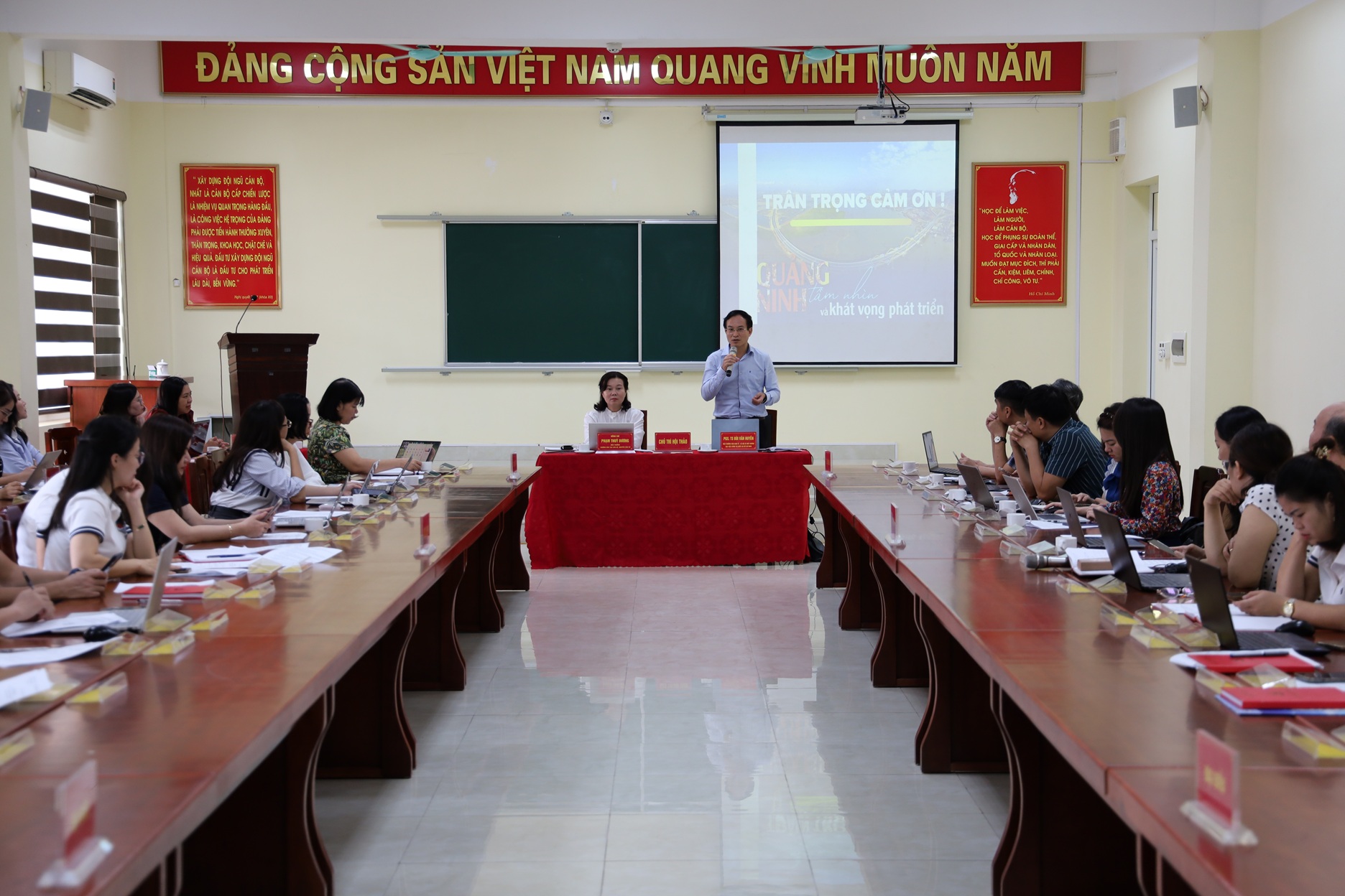 Phát biểu khai mạc Hội thảo, đồng chí Phạm Thùy Dương, Hiệu trưởng bày tỏ sự trân trọng, cảm ơn đối với Viện kinh tế - Xã hội và Môi trường khi lựa chọn Trường Đào tạo cán bộ Nguyễn Văn Cừ là đơn vị phối hợp tổ chức Hội thảo. Đồng chí cũng nêu khái quát tình hình phát triển kinh tế - xã hội, những định hướng của tỉnh Quảng Ninh trong xây dựng và phát triển địa phương, qua đó khẳng định ý nghĩa vai trò của Hội thảo.