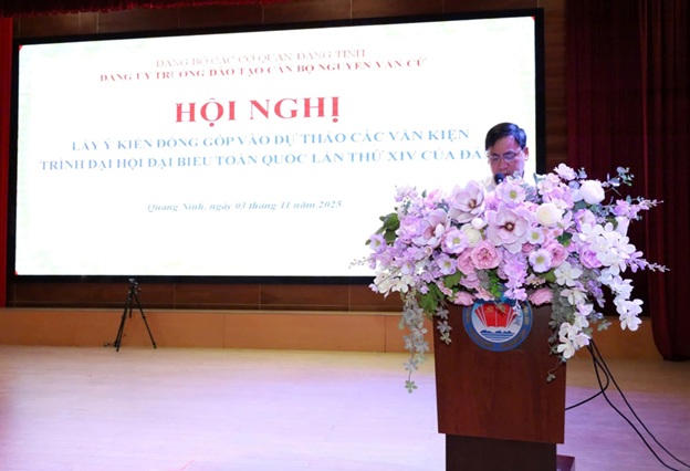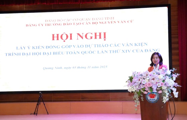 Sau Hội nghị trực tuyến, Trường Đào tạo cán bộ Nguyễn Văn Cừ tiếp tục tổ chức Hội nghị lấy ý kiến đảng viên về dự thảo các Văn kiện trình Đại hội đại biểu toàn quốc lần thức XIV theo hình thức trực tiếp. Kết thúc chương trình, đồng chí Phạm Thùy Dương, Bí thư Đảng ủy, Hiệu trưởng đã phổ biến tới đảng viên một số nội dung mới: Quy định số 366-QĐ/TW ngày 30/8/2025 về việc kiểm điểm và đánh giá, xếp loại chất lượng đối với tập thể cá nhân trong hệ thống chính trị; Hướng dẫn số 38-HD/BCTTW ngày 29/9/2025 của Ban Chấp hành Trung ương về hướng dẫn nghiệp vụ công tác đảng viên; Văn kiện Đại hội đại biểu tỉnh Quảng Ninh lần thứ XIV, nhiệm kỳ 2025-2030… và giao nhiệm vụ phòng Tổ chức hành chính, thông tin tư liệu tổng hợp ý kiến góp ý của cán bộ, đảng viên về dự thảo các văn kiện trình Đại hội đại biểu toàn quốc lần thứ XIV và xây dựng báo cáo chung.